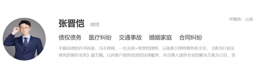张晋恺律师,擅长债权债务、医疗纠纷、交通事故、婚姻家庭、合同纠纷等,执业律所:云南典卫律师事务所,手握法律的丹书铁券,马不停蹄,一往无前~张晋恺律师,云南典卫律师事务所主任,《典当行业法律风控操作实务》副主编。以向客户提供优质的法律服务,向当事人提供专业的解决方案为己任,坚信信任与专业乃律师与客户之根本。一贯坚持以法为典,以勤为先,以智为基,以恒为本的做事原则,秉承待人以诚,立世以信的执业原则。在长期的工作中,办理了大量的民间借贷案件、合同案件、交通事故、医疗损害等人身损害赔偿案件以及劳动争议、离婚案件,起草审查合同上千份,对非诉讼业务始终坚持前期的法律风控强于事后的胜诉,现为多家企业、学校、医院、事业单位、行业协会的法律顾问。